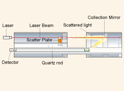 用激光光线对粉尘粒子进行辐射,通过镜片将其散射光(前方光散射方式)聚光、散射,通过石英棒进行检测。