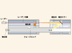 レーザー光線をダスト粒子に照射し、その散乱光(前方光散乱方式)をミラーで集光・散乱させクウォーツロッドを介して検出します。